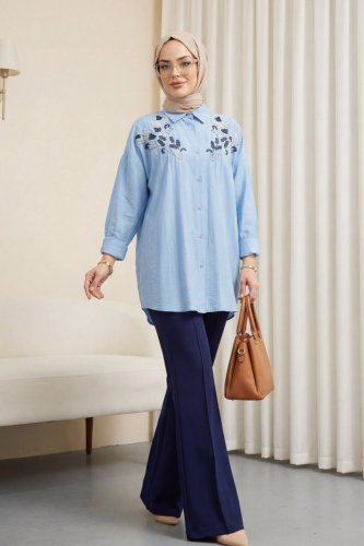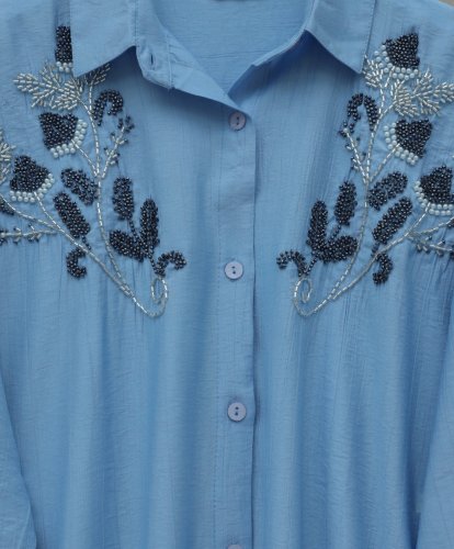 • Çiçek Boncuk Desenli Düğmeli Çilek Gömlek Açık Mavi