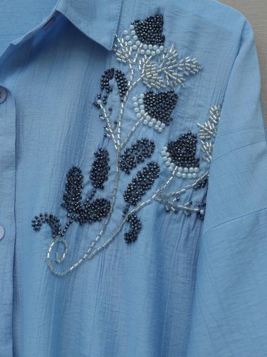 Çiçek Boncuk Desenli Düğmeli Çilek Gömlek Açık Mavi