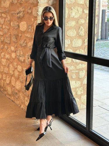 Kadın uzun kollu eteği fırfırlı beli kuşaklı trikoton tam boy gömlek elbise