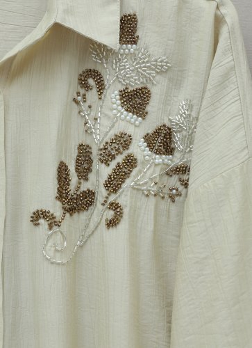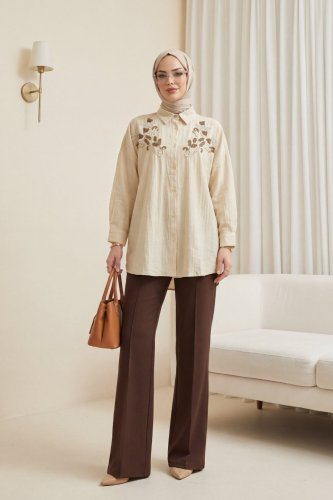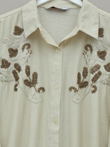 Çiçek Boncuk Desenli Düğmeli Çilek Gömlek Bej