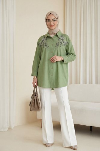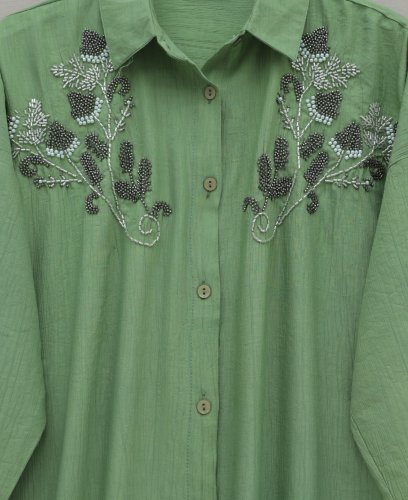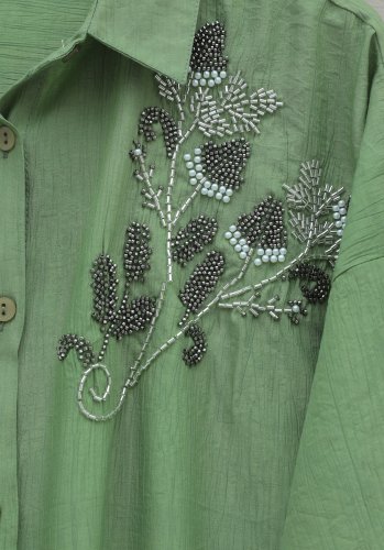 • Çiçek Boncuk Desenli Düğmeli Çilek Gömlek Yeşil